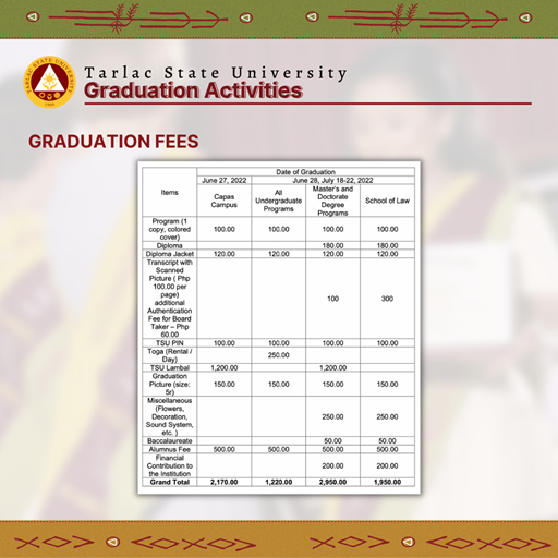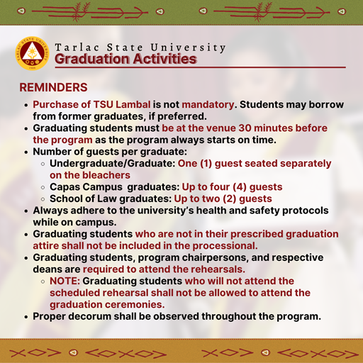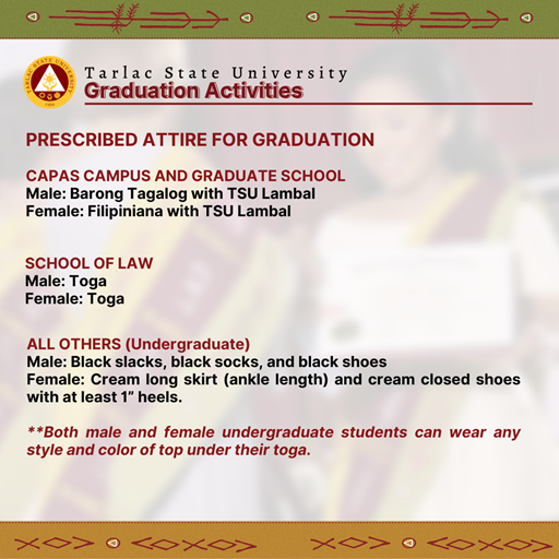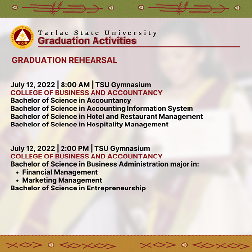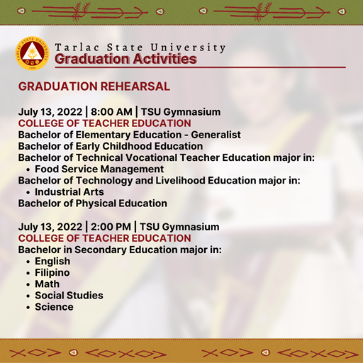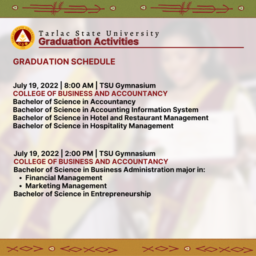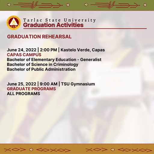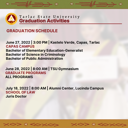 Tarlac State University will conduct face-to-face graduation ceremonies from June 27 to July 22, 2022 themed "Transformative, Innovative, and Interconnected Higher Education, Paving the Way to Greater Heights and Stronger Tomorrows."