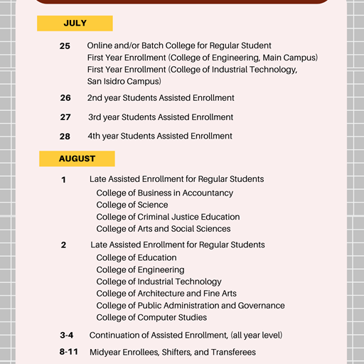 Specific enrollment schedules per program will be announced by your respective colleges.