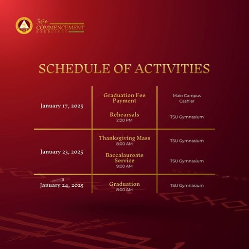 The activities and schedule for the 36th Commencement Exercises of Tarlac State University this January 24, 2025 is now available through TSU Memorandum Order No. 74, s. 2024.