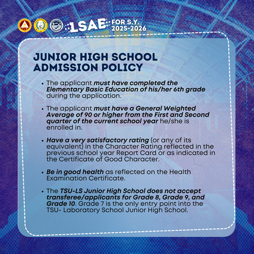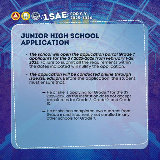 The online application for the Tarlac State University-Laboratory School Admission Evaluation (TSU LSAE) will be open starting February 1, 2025 (Saturday) until February 28, 2025 (Friday).