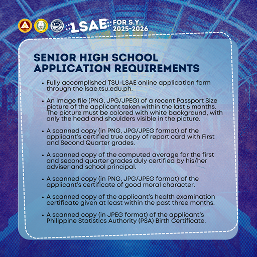 Requirements must be submitted through https://lsae.tsu.edu.ph